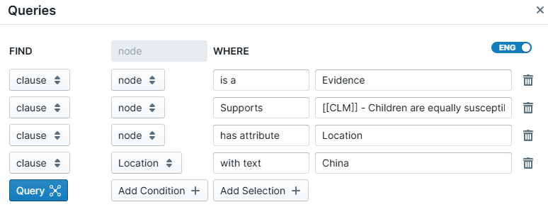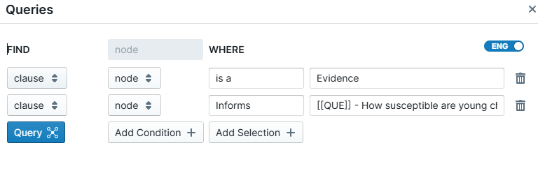 The query drawer component allows you to construct structured queries over your discourse graph, based on discourse relations (e.g., "find all evidence that supports/opposes a claim"), and reason over the results in a structured, tabular format (e.g., "find all evidence that supports a claim, and allow me to filter/sort by methodological details").